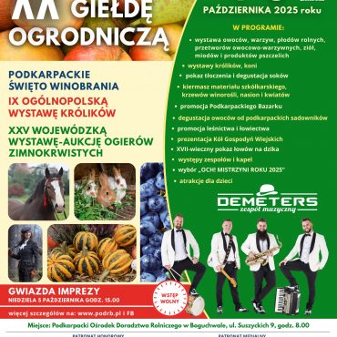 Dyrektor Podkarpackiego Ośrodka Doradztwa Rolniczego w Boguchwale Zbigniew Micał zaprasza na XX Jesienną Giełdę Ogrodniczą, która odbędzie się w dniach 4-5 października br. Szczegóły na plakacie.