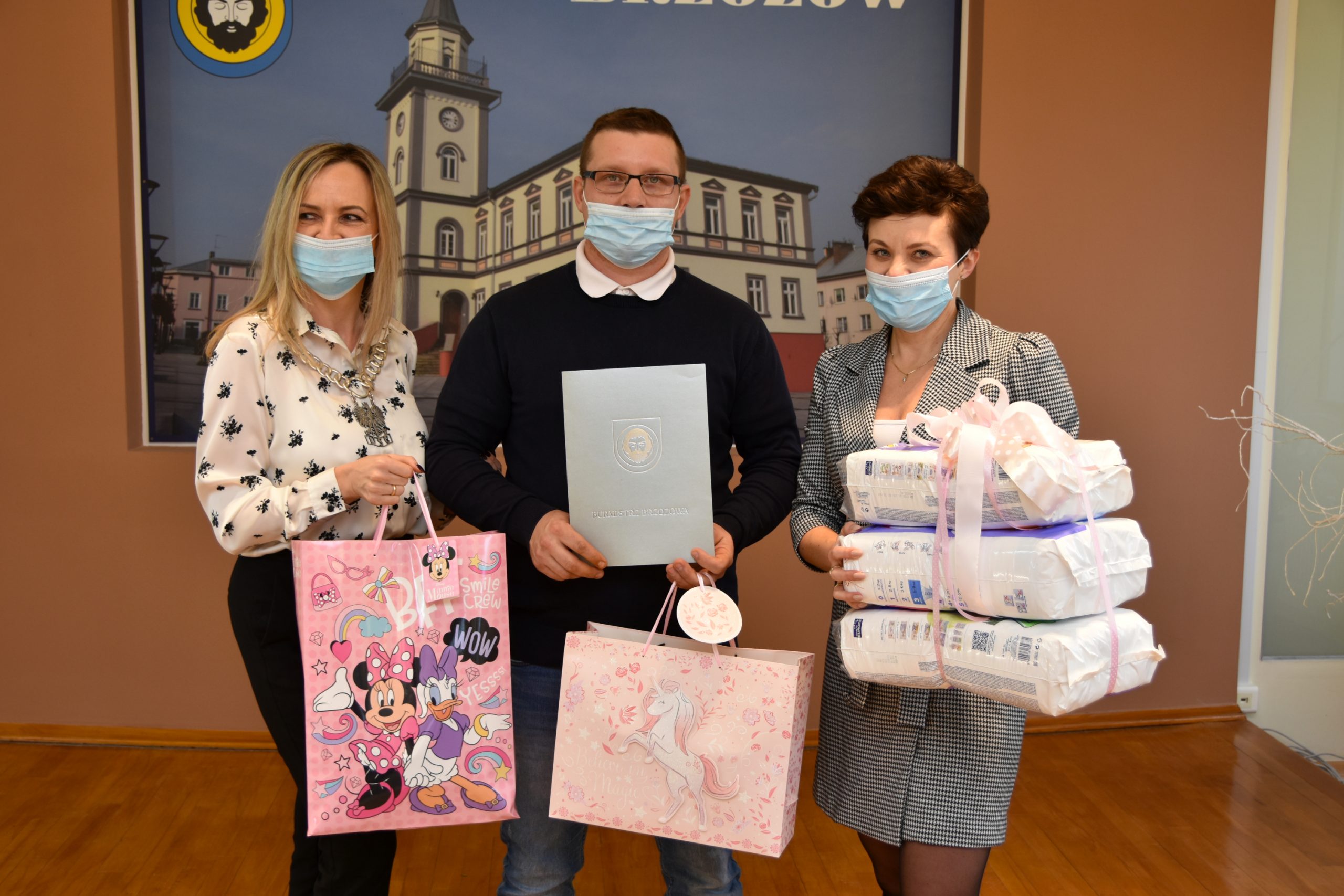 Pani Urszula Dąbrowska-Huber Kierownik USC w Brzozowie oraz Pani Agnieszka Wilk Naczelnik Wydziału Spraw Obywatelskich, w imieniu Burmistrza Brzozowa Szymona Stapińskiego, przekazały na ręce szczęśliwego taty, gratulacje i życzenia zdrowia dla pociechy i rodziców oraz wielu szczęśliwych chwil w nowym roku, który tak pięknie rozpoczął się dla młodego małżeństwa.
