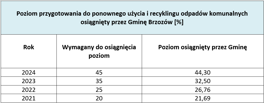 Poziomy recyklingu osiągnięte przez Gminę Brzozów.