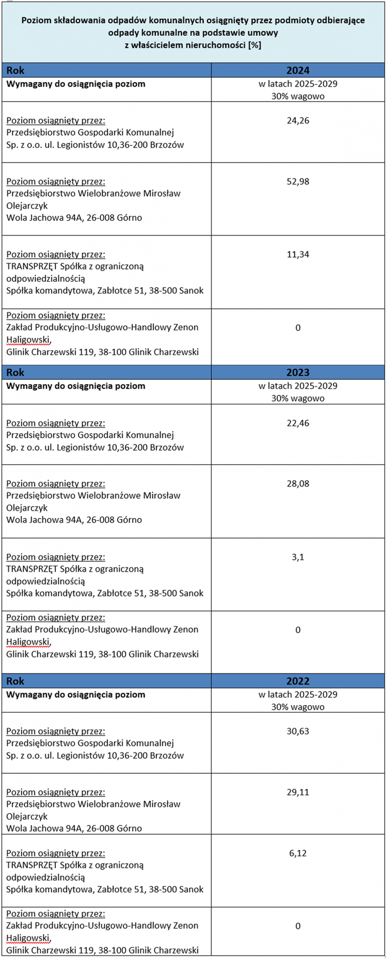 - Poziom ograniczenia masy odpadów komunalnych ulegających biodegradacji przekazywanych do składowania osiągnięty przez Gminę Brzozów w latach 2013 -2023