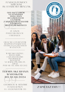 Termin składania wniosków trwa do 10 sierpnia 2024 r. Szczegóły na plakacie, stronie internetowej i w biurze Fundacji.
