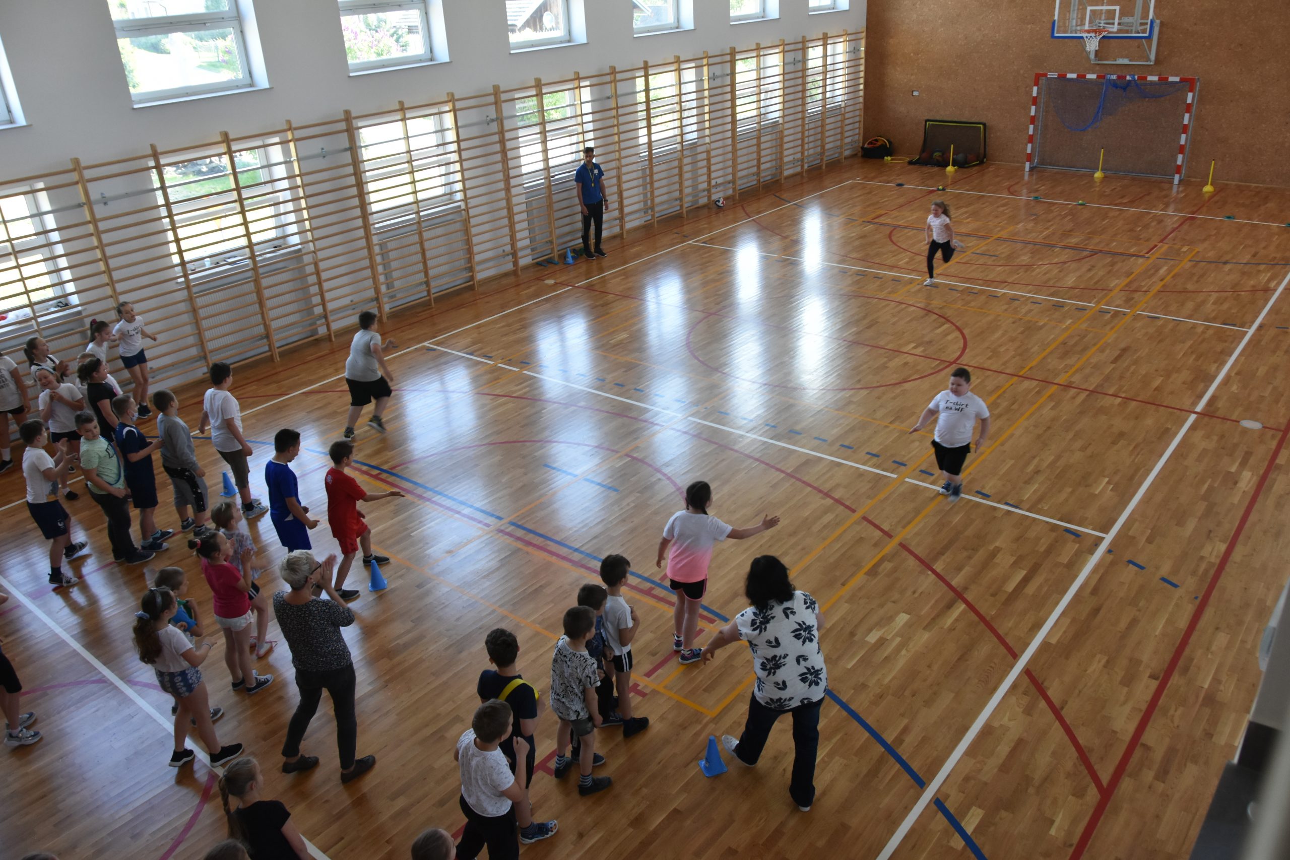 W sali gimnastycznej na młodsze dzieci czekały konkurencje sprawnościowe, za wykonanie których uczniowie zbierali punkty. Milusińscy z ogromnym zapałem brali udział w wyścigach i grach zespołowych. Humory dopisywały, radości z aktywności fizycznej nie było końca. Ponadto w tym dniu odbył się też charytatywny kiermasz dla Kubusia Zwierzchowskiego. Cały dochód ze sprzedaży przygotowanych ciast, słodkości zostanie przeznaczony na jego leczenie.