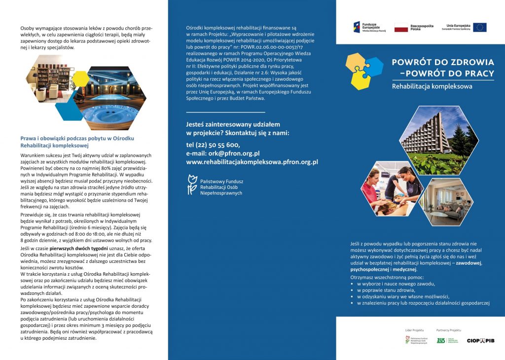 Państwowy Fundusz Rehabilitacji Osób Niepełnosprawnych, realizuje projekt pn. „Wypracowanie i pilotażowe wdrożenie modelu kompleksowej rehabilitacji umożliwiającej podjęcie lub powrót do pracy”