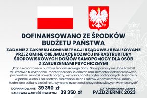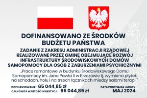 Zadanie dofinansowane ze środków budżetu państwa z zakresu administracji rządowej realizowanego przez gminę obejmujące rozwój infrastruktury środowiskowych domów samopomocy dla osób z zaburzeniami psychicznymi w zakresie remontu Środowiskowego Domu Samopomocy im. Jana Pawła II w Brzozowie.