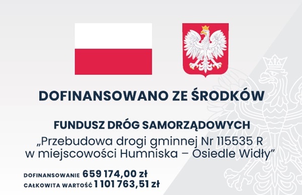 - Przebudowa drogi gminnej Nr 115535R w miejscowości Humniska – Osiedle Widły