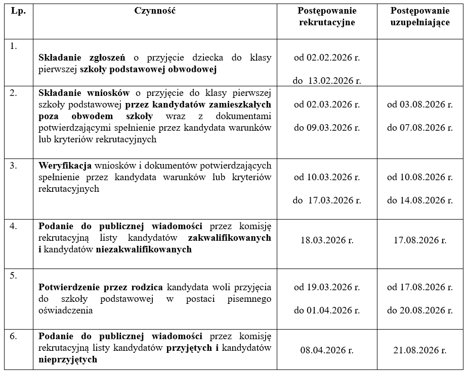 Do klasy I szkoły podstawowej kandydaci zamieszkali w obwodzie danej szkoły przyjmowani są z urzędu, na podstawie zgłoszenia rodziców złożonego w terminie od 2 – 13 lutego 2026 r.