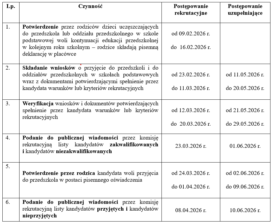 Rodzice dzieci uczęszczających obecnie do danego przedszkola corocznie składają na kolejny rok szkolny deklarację o kontynuowaniu wychowania przedszkolnego w terminie od 9 – 16 lutego 2026 r. Niezłożenie deklaracji oznaczać będzie rezygnację z miejsca w aktualnym przedszkolu/oddziale przedszkolnym w szkole podstawowej.