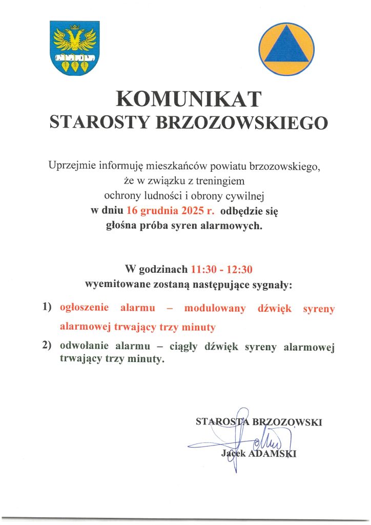 Starosta Brzozowski uprzejmie informuje, że w dniu 16 grudnia 2025 r., w godzinach 11:30–12:30, na terenie powiatu brzozowskiego przeprowadzona zostanie głośna próba syren alarmowych w ramach treningu ochrony ludności i obrony cywilnej.