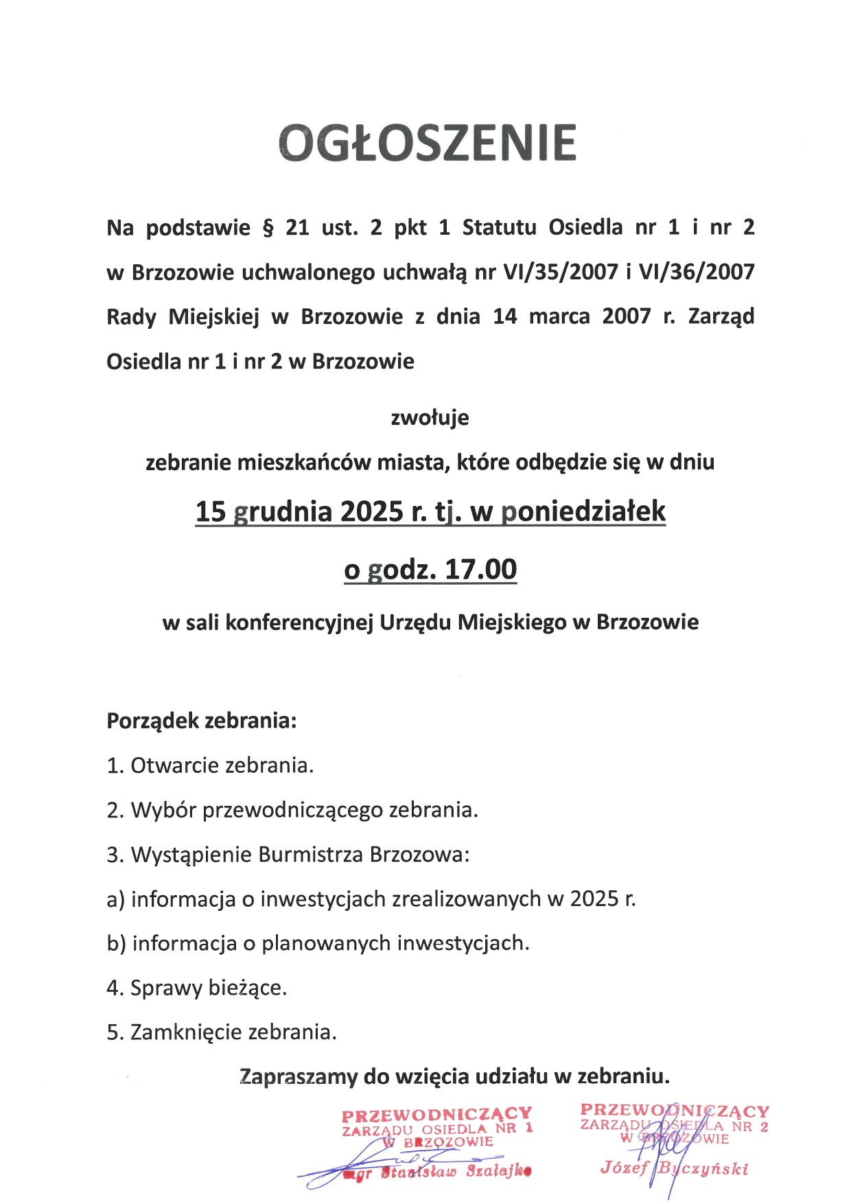 Ogłoszenie o zebraniu mieszkańców miasta