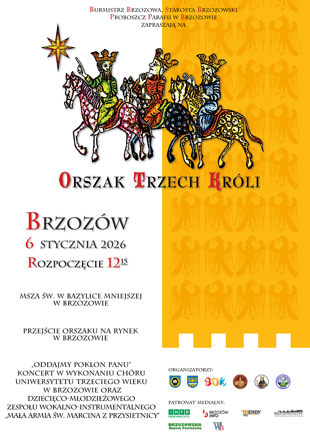 Z radością zapraszamy mieszkańców naszej gminy do udziału w Orszaku Trzech Króli, który odbędzie się 6 stycznia 2026 roku . Wydarzenie rozpocznie się o godz. 12:15 Mszą Świętą w Bazylice Mniejszej w Brzozowie. Następnie uczestnicy uformują orszak i wspólnie przejdą na Rynek.
