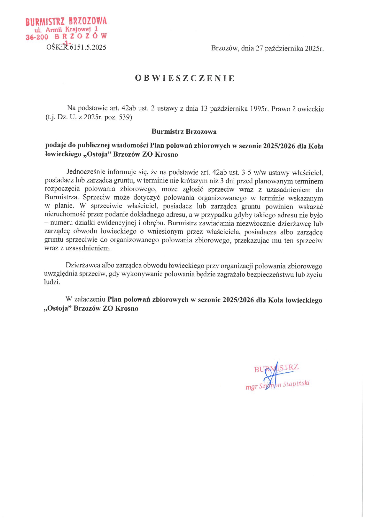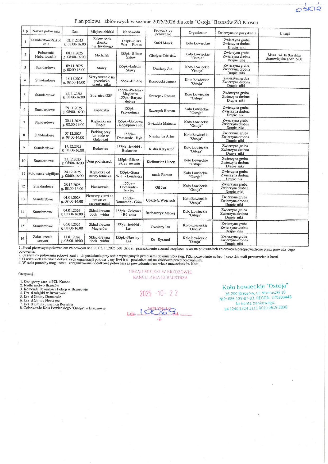 28.10.2025 Plan polowań zbiorowych w sezonie 2025/2026 dla Koła łowieckiego „Ostoja” Brzozów ZO Krosno