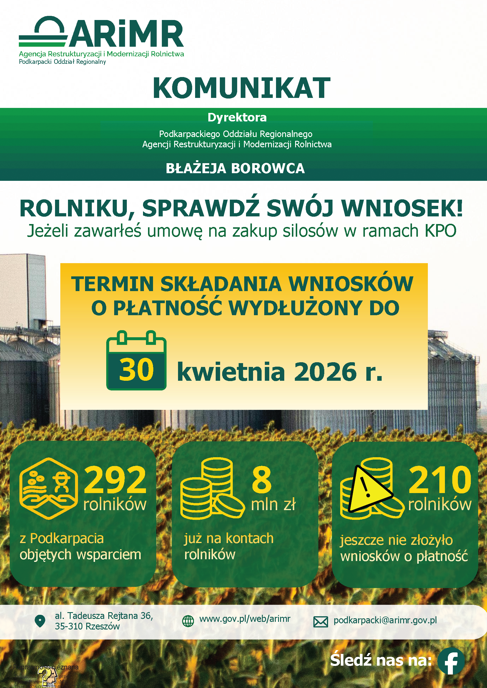 Wydłużenie terminu ma na celu umożliwienie beneficjentom zakończenie inwestycji oraz złożenia wniosków o płatność. W ramach obszaru „Wsparcie infrastruktury magazynowania służącej zwiększeniu odporności gospodarstw rolnych na kryzysy” realizowanego w ramach KPO 523 rolników z terenu województwa podkarpackiego zawarło umowy o objęcie wsparciem na zakup silosów. Dotychczas 292 rolników otrzymało środki finansowe w łącznej wysokości blisko 8,0 mln zł. Jednocześnie 210 rolników, którzy zawarli umowy o dofinansowanie, nie złożyło jeszcze wniosków o płatność.