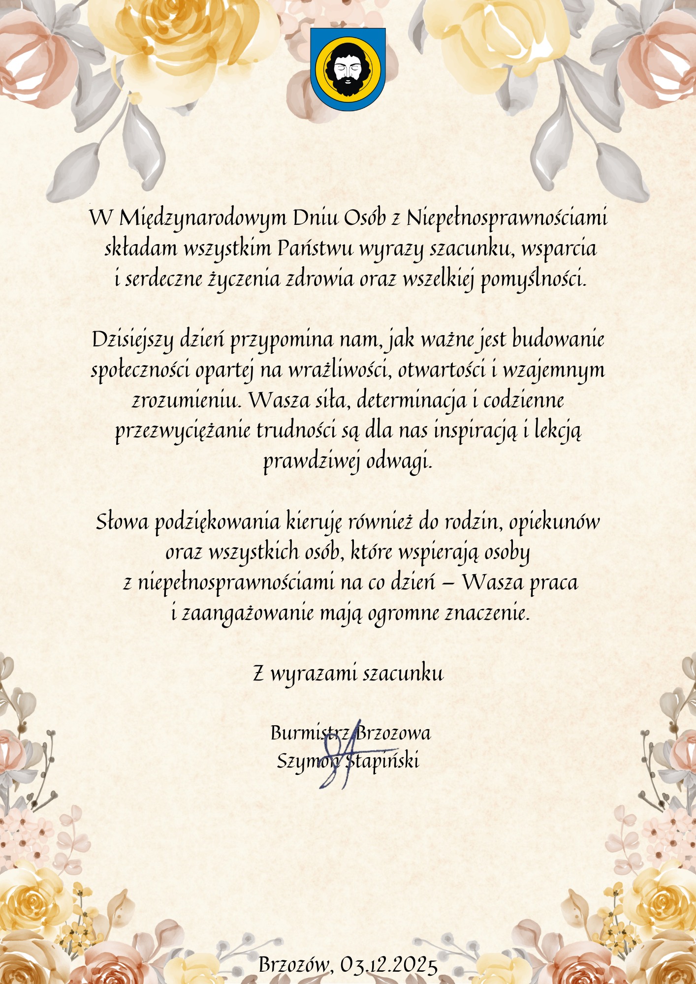 Życzenia Burmistrza Brzozowa z okazji Międzynarodowego Dnia Osób z Niepełnosprawnościami