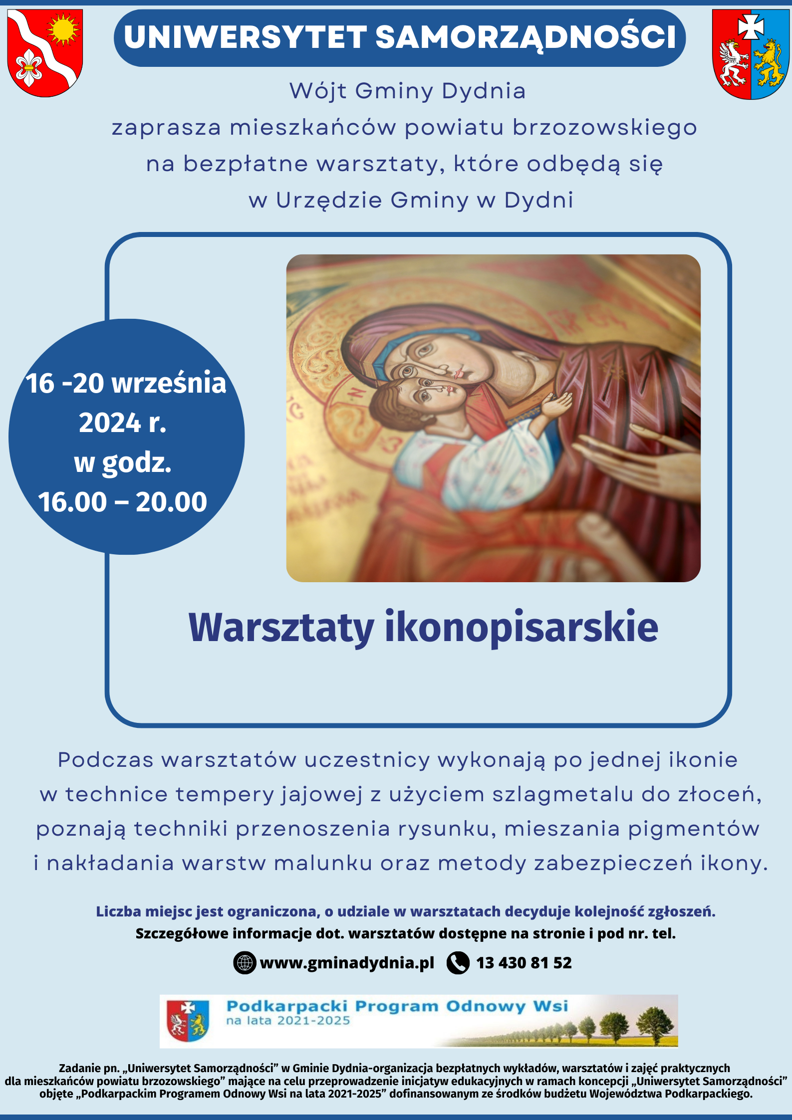 W związku z realizacją przez Gminę Dydnia zadania pn.: „Uniwersytet Samorządności” w Gminie Dydnia – organizacja bezpłatnych wykładów, warsztatów i zajęć praktycznych dla mieszkańców powiatu brzozowskiego” w ramach II etapu koncepcji „Uniwersytet Samorządności” objętej Podkarpackim Programem Odnowy Wsi na lata 2021-2025 dofinansowanym ze środków budżetu Województwa Podkarpackiego, zwracamy się z uprzejmą prośbą o udostępnienie na Państwa stronie internetowej zaproszenia dla mieszkańców powiatu brzozowskiego na bezpłatne warsztaty ikonopisarskie, które odbędą się w dniach od 16 do 20 września 2024 r. (tj. od poniedziałku do piątku). Warsztaty rozpoczynać się będą o godzinie 16:00 w Sali Urzędu Gminy Dydnia (Dydnia 224).