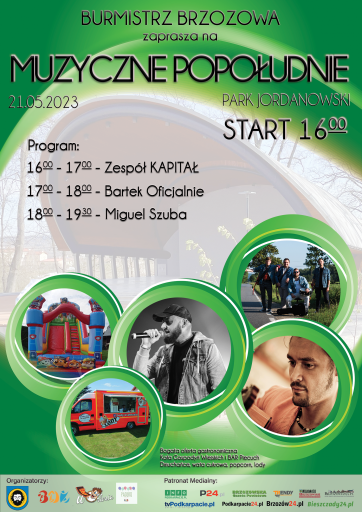 Burmistrz Brzozowa zaprasza na Muzyczne Popołudnie w Parku Jordanowskim w niedzielę 21.05.2023 r. Szczegóły na załączonym plakacie.