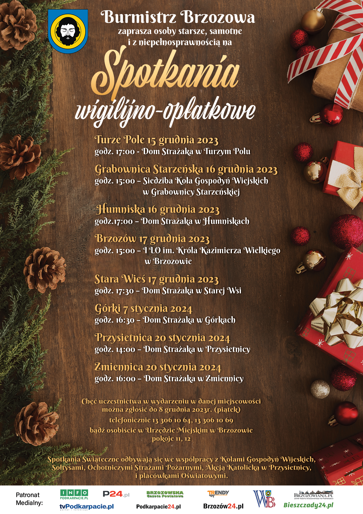 Burmistrz Brzozowa zaprasza osoby starsze, samotne i z niepełnosprawnościami na Spotkania Wigilijno-opłatkowe w każdej miejscowości naszej Gminy. W tym wyjątkowym czasie, zapomnijmy o dotykających nas problemach i Spotkajmy się przy jednym stole. Niechaj niezwykła atmosfera Świąt Bożego Narodzenia, będzie udziałem Nas wszystkich.