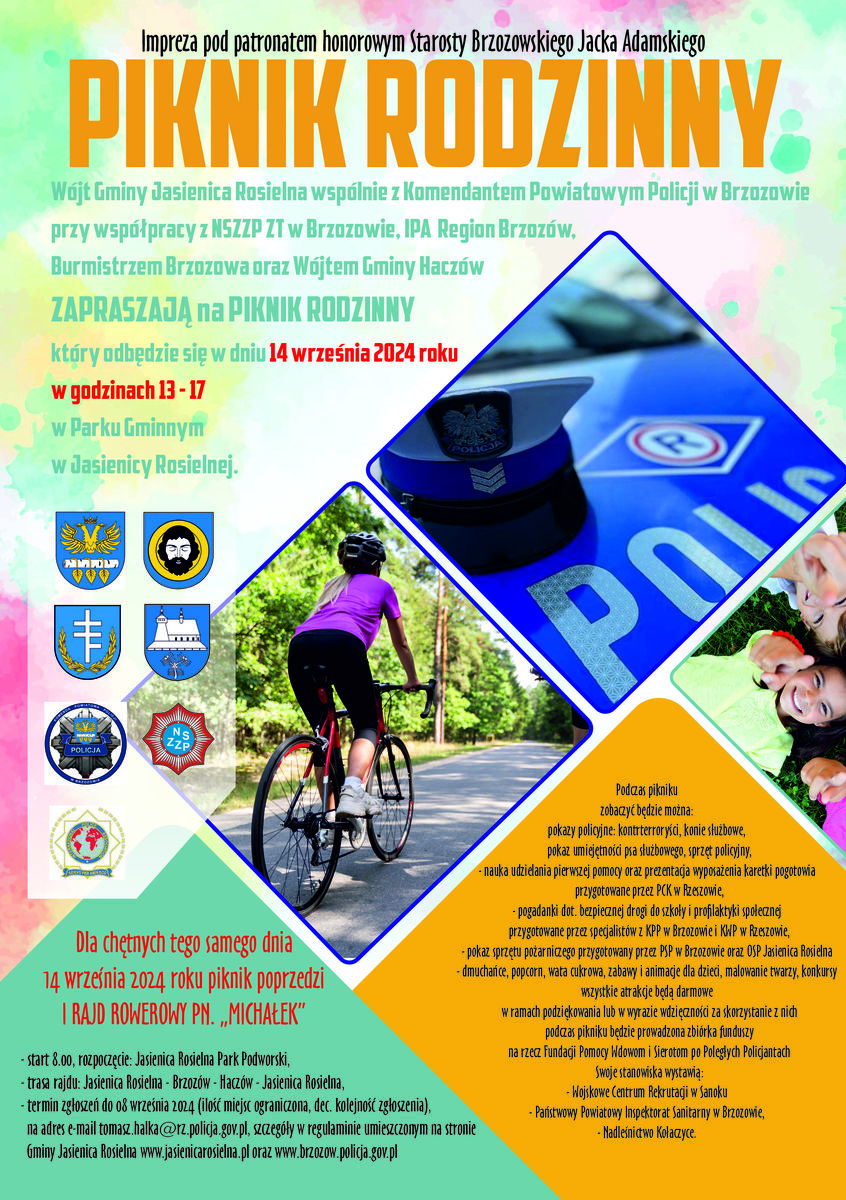Komendant Powiatowy Policji w Brzozowie wspólnie z Wójtem Gminy Jasienica Rosielna, Wójtem Gminy Haczów, Burmistrzem Brzozowa, NSZZP ZT w Brzozowie oraz IPA Region Brzozów mają zaszczyt zaprosić policjantów i pracowników Policji oraz mieszkańców powiatu brzozowskiego do udziału w I Rajdzie Rowerowym „MICHAŁEK” na trasie Jasienica Rosielna – Brzozów – Haczów – Jasienica Rosielna, jak również do udziału w Pikniku Rodzinnym, który będzie zwieńczeniem rajdu, a odbędzie się w godzinach 13.00 – 17.00. Patronat nad wydarzeniem objął Starosta Brzozowski. Wstęp bezpłatny.