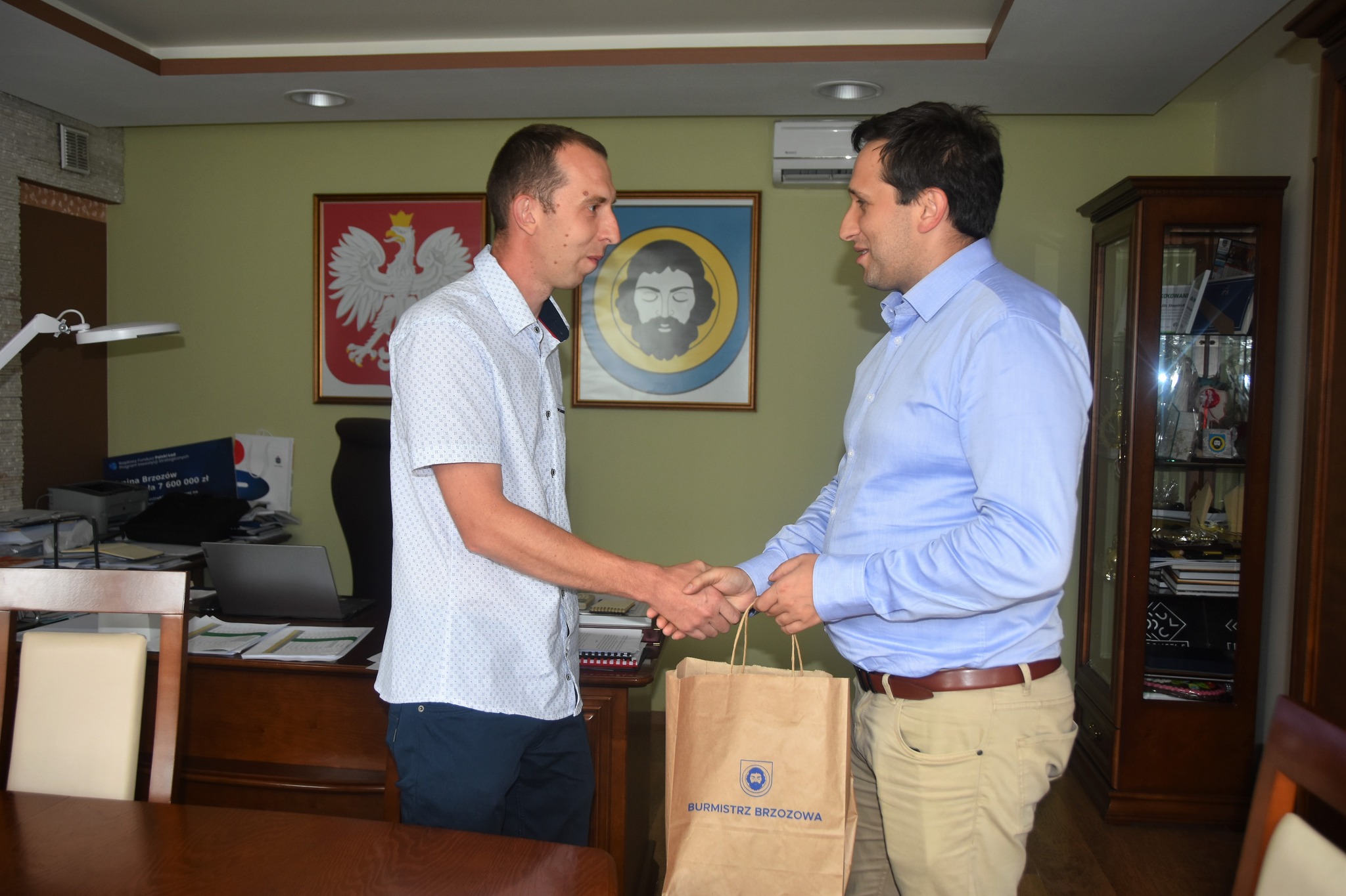 Burmistrz Brzozowa Szymon Stapiński spotkał się dzisiaj tj. 25 lipca br. z Panem Jakubem Drożdżalem, listonoszem pracującym w brzozowskiej placówce Poczty Polskiej, który uratował życie starszej mieszkance naszej gminy.