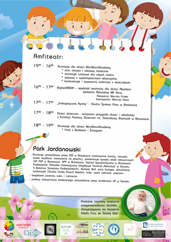 10 -lecie Zespół Świetlic Środowiskowych – malowanie twarzy, tatuaże, bańki mydlane, malowanie na stretchu)Ponadto w programie występy dzieci i młodzieży ze Studia Śpiewu Flow w Brzozowie i Fundacji Pomocy Dzieciom im. Stanisławy Bieńczak w Brzozowie. Na scenie z premierowym spektaklem teatralnym “BajkoLANDIA” zaprezentuje się też Akademia Wokalno-Aktorska MF. Artis w Brzozowie.