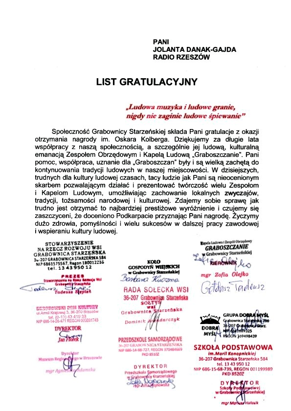 Jednym z tegorocznych laureatów nagrody im. Oskara Kolberga została Pani Jolanta Danak-Gajda. To najwyższy laur dla twórców i osób zajmujących się kulturą ludową w Polsce. Pani Jolanta jest od wielu lat znana miłośnikom muzyki ludowej z audycji Radia Rzeszów: „Na ludową nutę”, „Plebiscyt Kapel Ludowych Radia Rzeszów”.