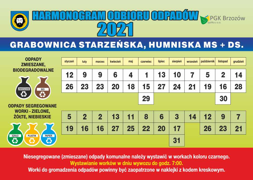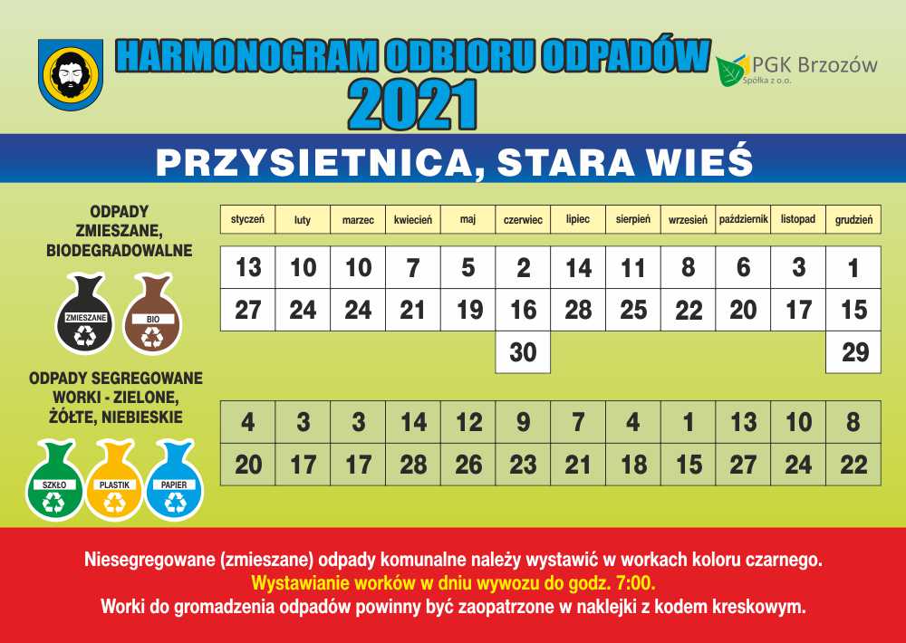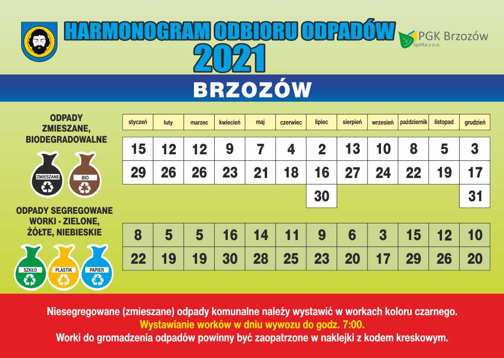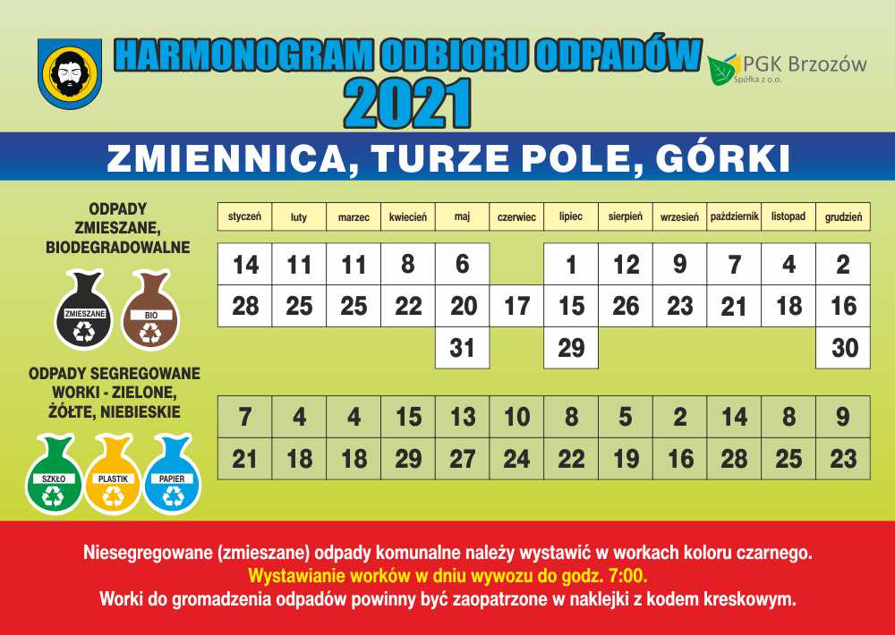 Harmonogram odbioru odpadów komunalnych na 2021 r. z podziałem na miejscowości.