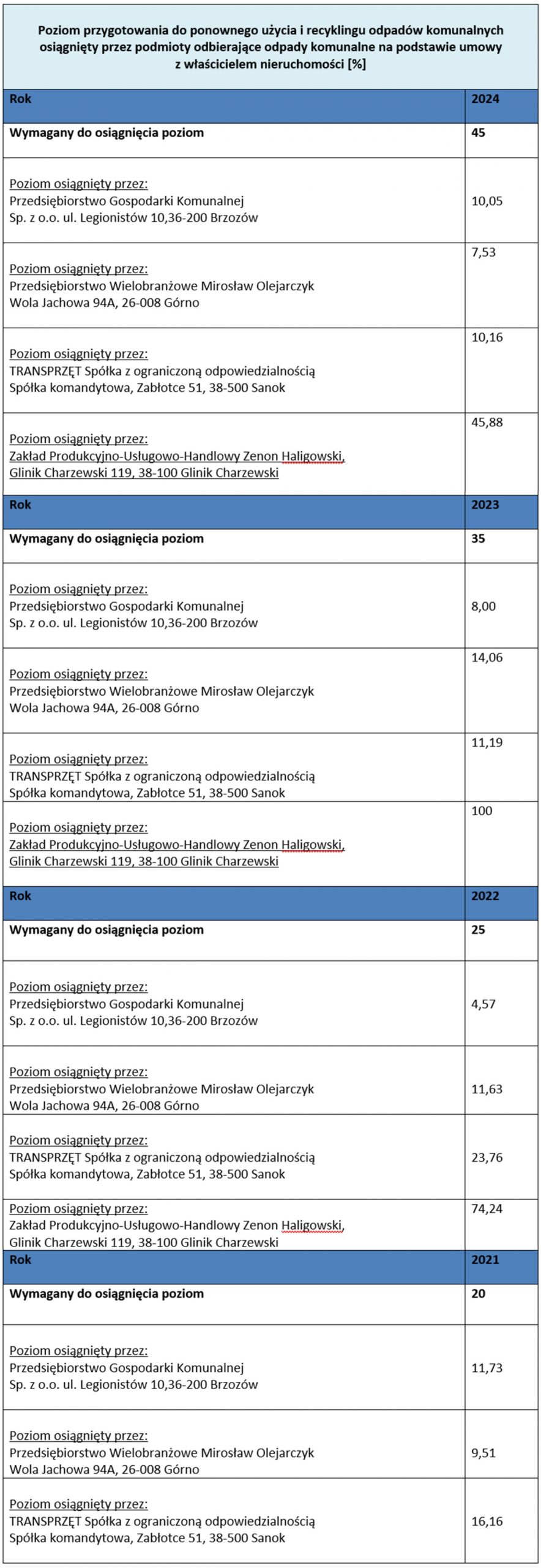 Poziomy recyklingu osiągnięte przez Gminę Brzozów.