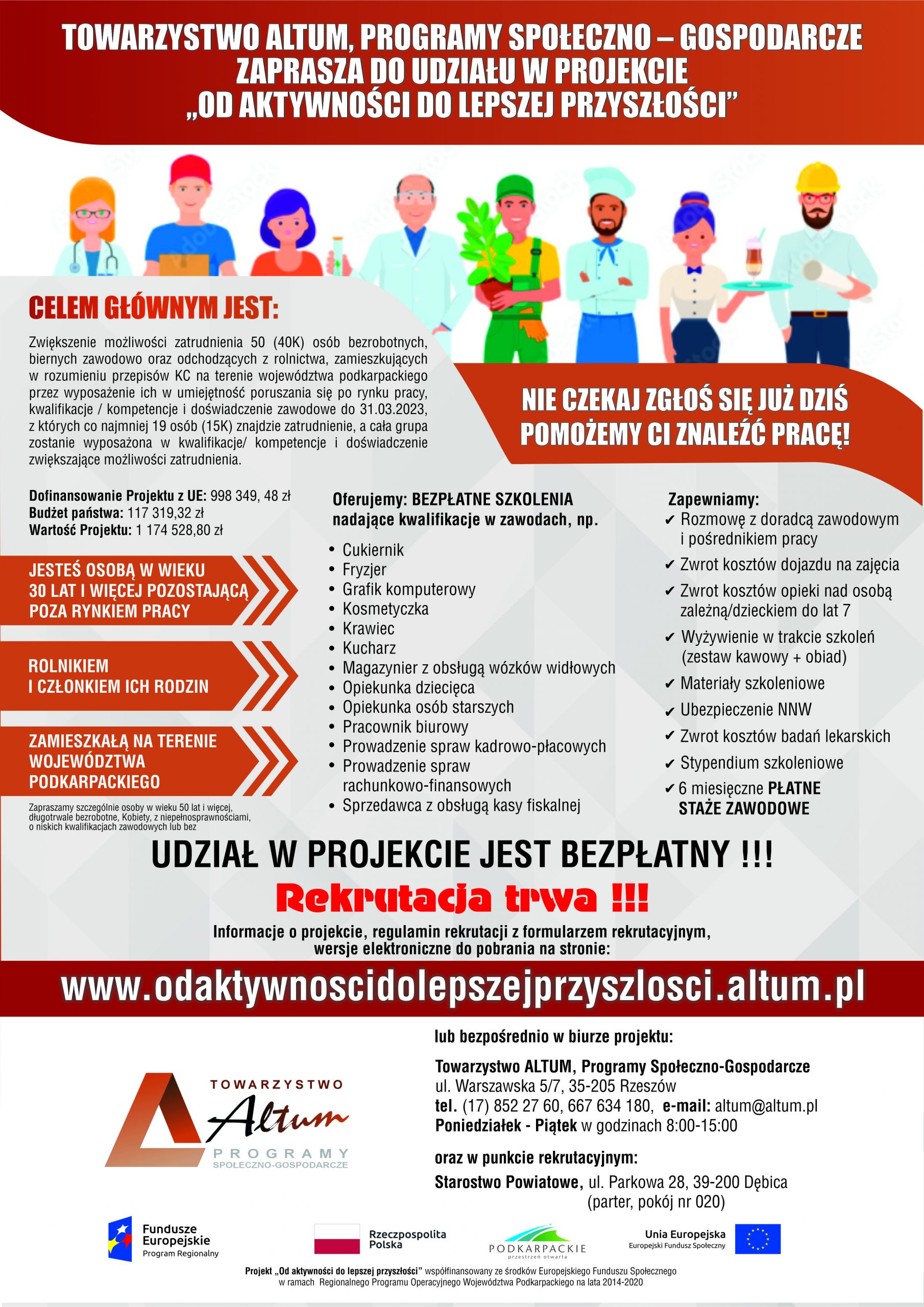 Do udziału kwalifikują się osoby powyżej 30 roku życia (od dnia 30 urodzin) zamieszkujące w województwie podkarpackim i które mają chęć powrócić na rynek pracy. Uczestnikom projektu oferujemy bezpłatne poradnictwo zawodowe, pośrednictwo pracy, szkolenie zawodowe wraz z egzaminem nadające kwalifikacje zawodowe (w tym stypendium szkoleniowe), płatny 6 miesięczny staż zawodowy, pracę po zakończeniu staż