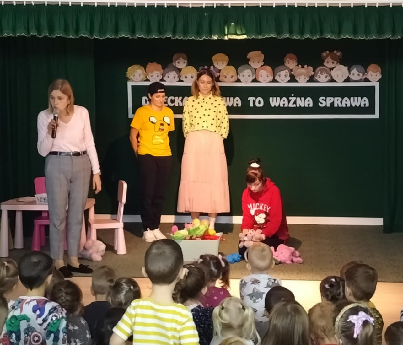 Dziecięce prawa zostały ukazane w prosty, obrazowy sposób, w krótkich scenkach domowych, w których wystąpiły panie nauczycielki. Pojawił się również symboliczny znak STOP, używany w sytuacjach związanych z łamaniem praw. Spotkanie przebiegało z aktywnym udziałem przedszkolaków, co świadczy o zrozumienie tematyki, a zakończyło się tanecznymi zabawami integracyjnymi.
