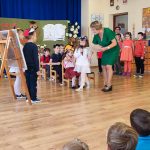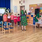 Zgromadzonych gości przywitała pani dyrektor Małgorzata Florczak, która w kilku słowach przypomniała wszystkim, że bycie nauczycielem nie jest jedynie profesją, ale całożyciową misją. Pani dyrektor wyróżniła za pracę na rzecz środowiska lokalnego i zaangażowanie dwoje nauczycieli wręczając im nagrody dyrektora. Zebrani goście, emerytowani nauczyciele, pracownicy placówki i przedszkolaki z przyjemnością obejrzały występ dzieci z oddziału Biedronki, które zaprezentowały inscenizację do utworu „Jak wróbelek Elemelek w szkole uczył się literek”. Dzieci do występu przygotowała pani Celina Wolanin.