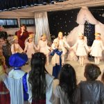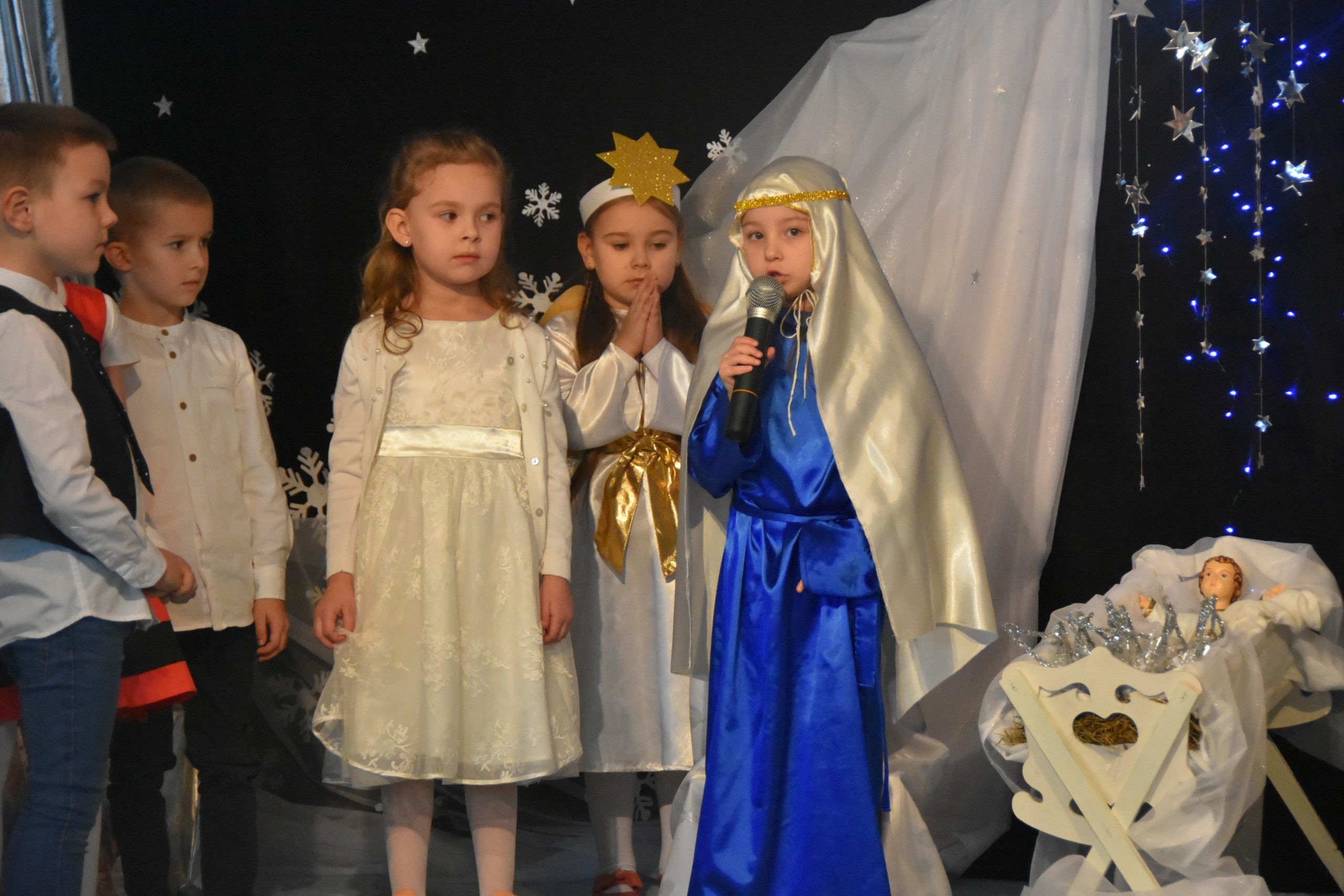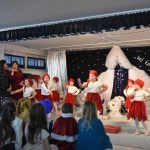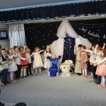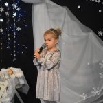 Dalszą część przeglądu poprowadziła pani Teresa Nogaj, która jednocześnie czuwała nad jego prawidłowym przebiegiem. Niezwykle zimowy, świąteczny i podniosły charakter uroczystości podkreślała piękna scenografia. Na scenie oprócz wykonawców kolęd pojawiły się dzieci z grup: ,,Odkrywcy”, ,,Motylki’’, ,,Sportowcy”, które zaprezentowały się w scence ,,Przy żłóbku’’, kolędach, okolicznościowych piosenkach i tańcach. Punktem kulminacyjnym części artystycznej był niosący przesłanie miłości taniec z sercami.