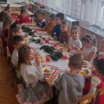 Po obejrzanych Jasełkach wszyscy zaproszeni Goście wysłuchali Ewangelii wg Św. Łukasza o narodzeniu Jezusa, połamali się opłatkiem, złożyli sobie życzenia i usiedli do wigilijnego stołu. Tego dnia do przystrojonych stołów zasiadła również cała społeczność przedszkola. Dzieci dzieliły się opłatkiem, życzyły sobie wesołych świąt i wspólnie z Paniami kolędowały dla małego Jezuska.