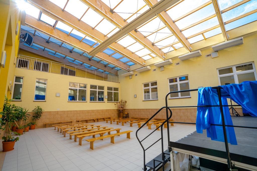 - Nowoczesny budynek szkoły z przeszklonym atrium wyposażonym w scenę i nagłośnienie.