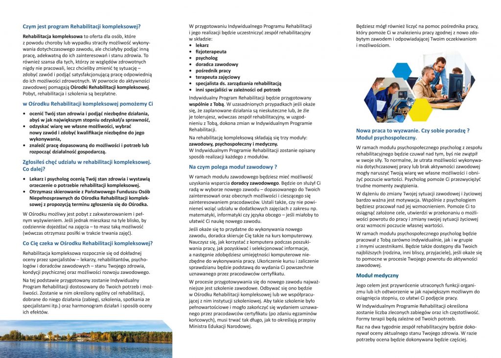 Państwowy Fundusz Rehabilitacji Osób Niepełnosprawnych, realizuje projekt pn. „Wypracowanie i pilotażowe wdrożenie modelu kompleksowej rehabilitacji umożliwiającej podjęcie lub powrót do pracy”