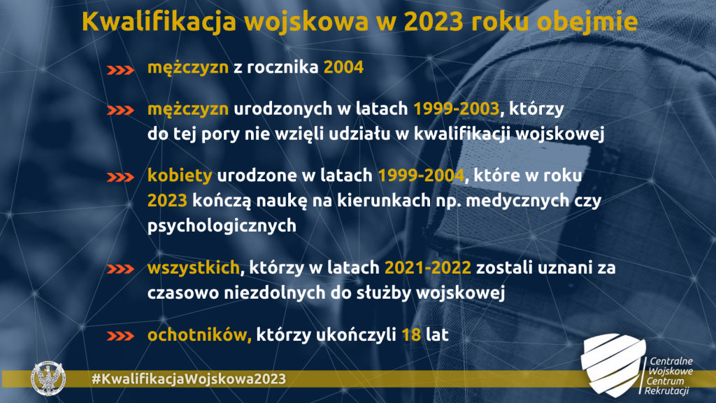 Na kwalifikację wojskową wezwania otrzymało 450 osób z całego powiatu brzozowskiego, w tym z naszej gminy 199 osób. Są to przede wszystkim mężczyźni urodzeni w 2004 roku i mężczyźni urodzeni w latach 1999-2003, którzy nie posiadają określonej kategorii zdolności do czynnej służby wojskowej. Ponadto na kwalifikację wzywane są kobiety urodzone w latach 1999-2004, posiadające kwalifikacje przydatne do czynnej służby wojskowej lub pobierające naukę w celu uzyskania tych kwalifikacji, które w roku szkolnym lub akademickim 2022/2023 kończą naukę w szkołach lub uczelniach medycznych i weterynaryjnych oraz na kierunkach psychologicznych albo będące studentkami lub absolwentkami tych szkół lub kierunków o których mowa w rozporządzeniu Rady Ministrów.