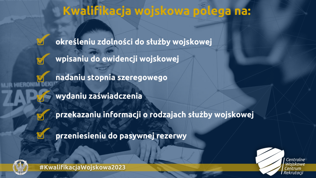 Kwalifikacja wojskowa ma na celu ustalenie aktualnej zdolności do służby wojskowej. Każda osoba zgłaszająca się do kwalifikacji wojskowej ma zakładaną ewidencję wojskową i otrzymuje orzeczenie lekarskie z określoną kategorią zdolności do służby wojskowej. Na kwalifikację wojskową należy zabrać ze sobą: dowód osobisty lub inny dokument pozwalający na ustalenie tożsamości; posiadaną dokumentację medyczną – w celu przedstawienia jej powiatowej komisji lekarskiej; dokumenty potwierdzające poziom wykształcenia, kwalifikacje zawodowe lub pobieranie nauki.