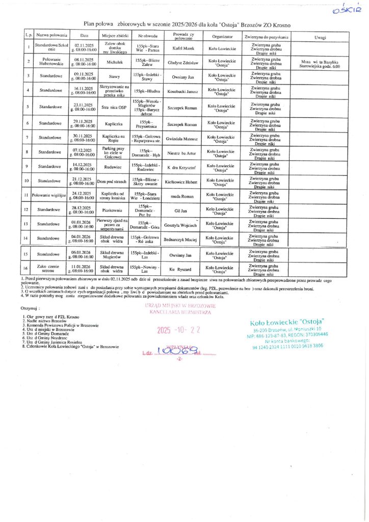 Plan polowań zbiorowych w sezonie 2025/2026 dla Koła łowieckiego „Ostoja” Brzozów ZO Krosno